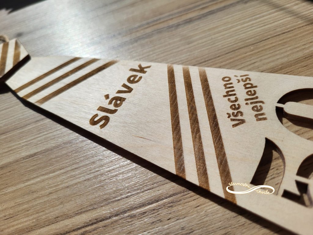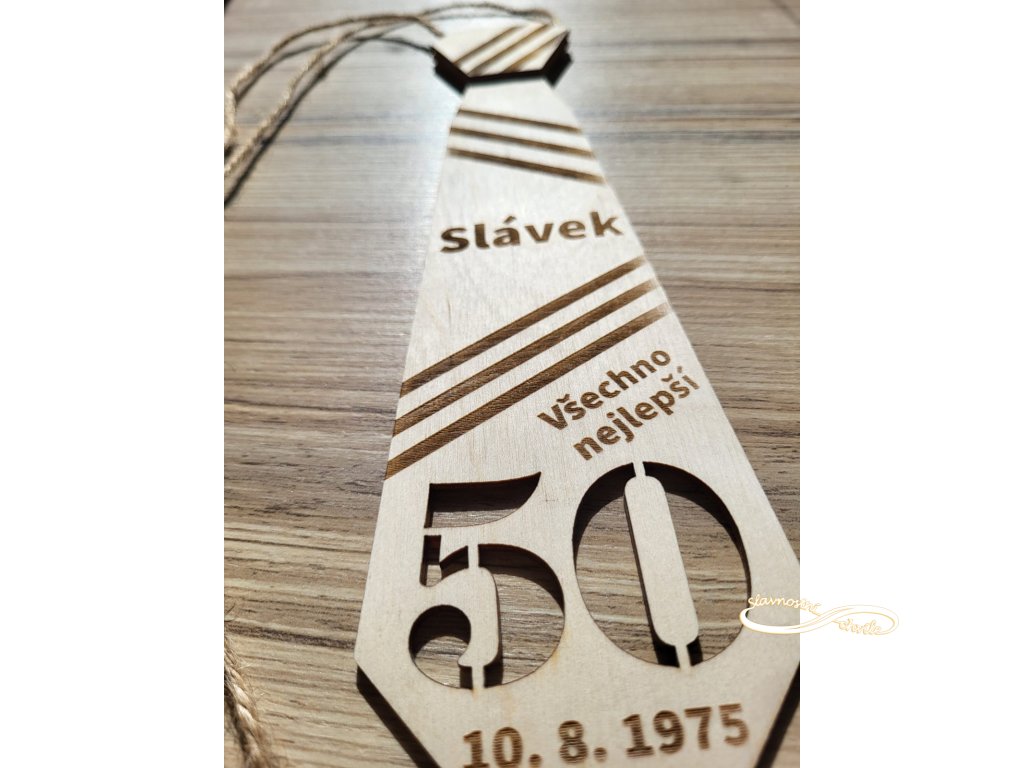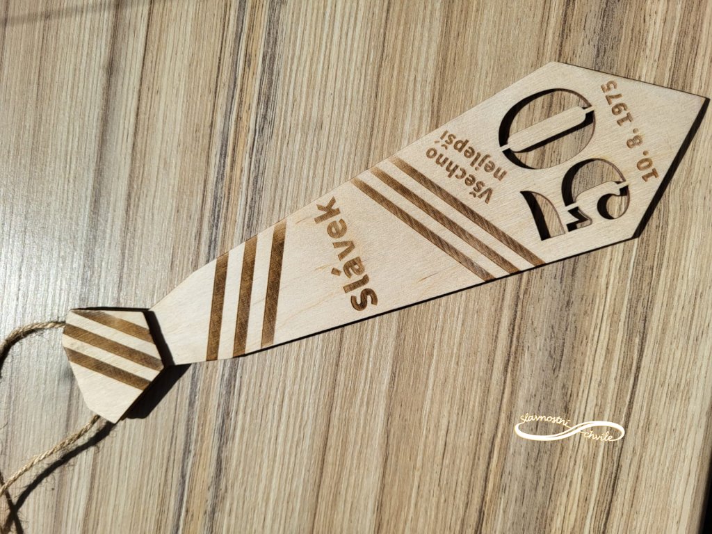 Originální dřevěná gravírovaná kravata jako osobitý dárek k narozeninám. Originální a elegantní dárek pro oslavence, který bude sloužit jako vzpomínka na nezapomenutelnou narozeninovou párty.