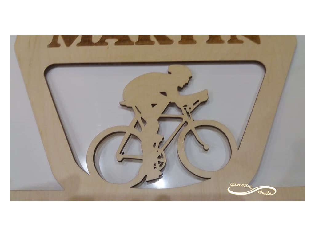 Dřevěný věšák na medaile se jménem a motivem CYKLISTIKA - pro velké i malé sportovce.